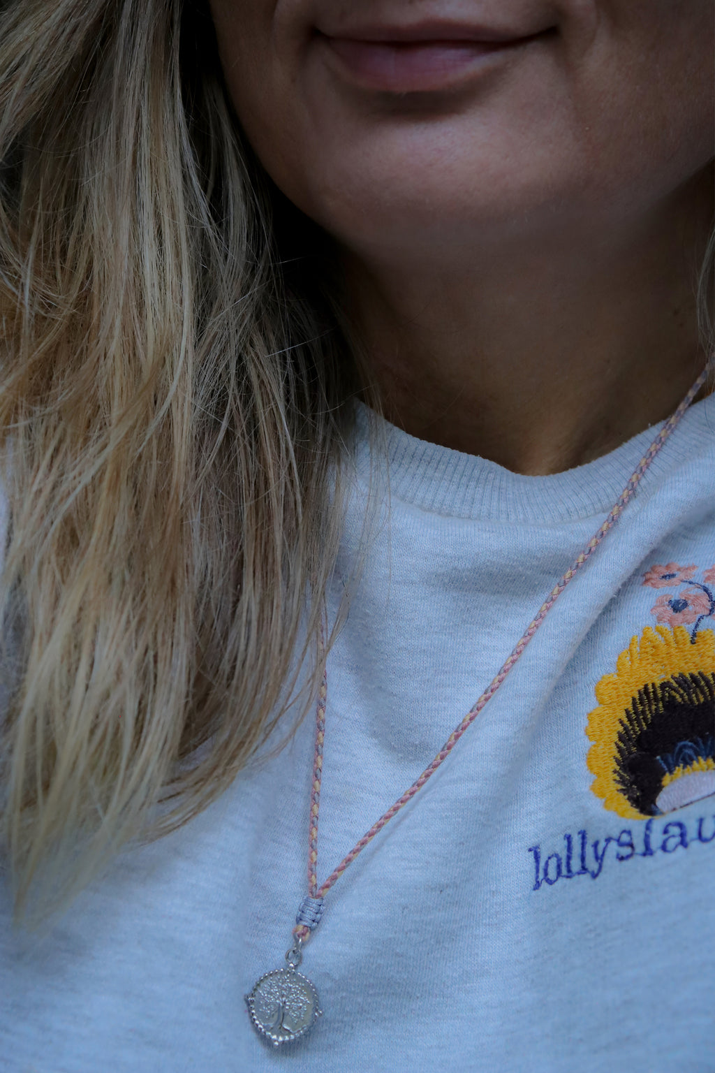 Diese handgefertigte Kette aus geflochtener Baumwollschnur bringt pure Natürlichkeit und guten Vibe in dein Leben. In sanften Erdtönen gehalten und mit einem feinen Lebensbaum-Anhänger aus Edelstahl, erinnert sie dich daran, geerdet zu bleiben – und trotzdem frei zu wachsen. Längenverstellbar, angenehm zu tragen und perfekt zum Kombinieren mit anderen Lieblingsketten – ob beim Yoga, am Strand oder im Alltag. Ein kleiner Talisman, der dich sanft daran erinnert: Alles ist verbunden. Du bist genau da, wo du sein sollst. Dein neuer Lieblingsbegleiter für Herz, Seele & Spirit.