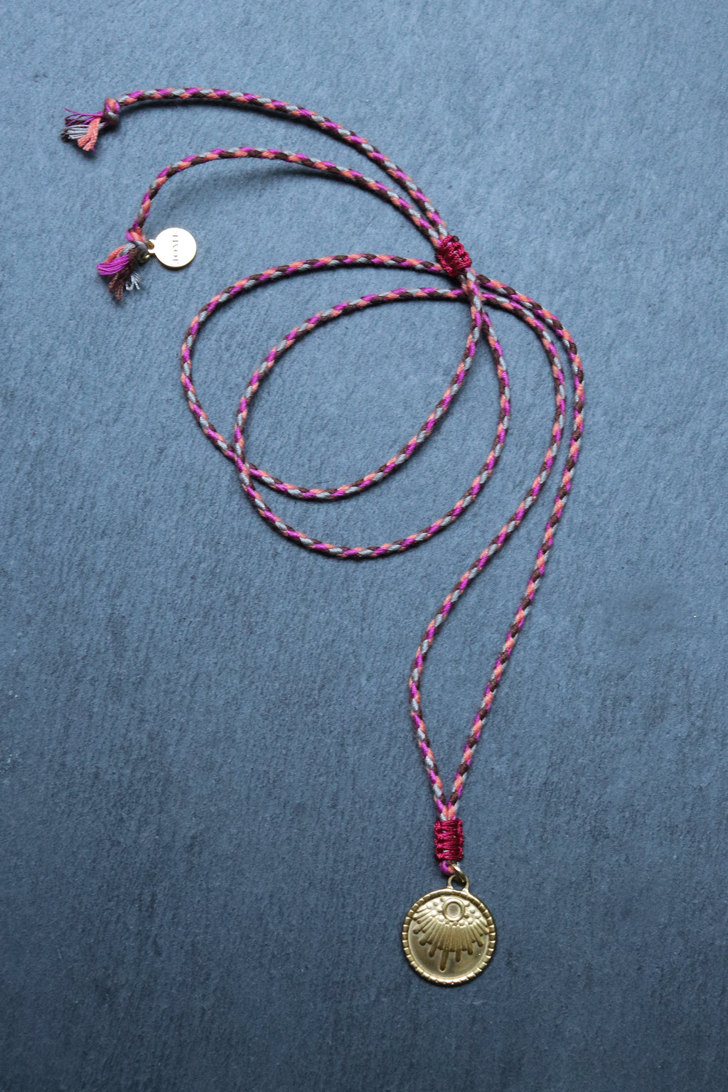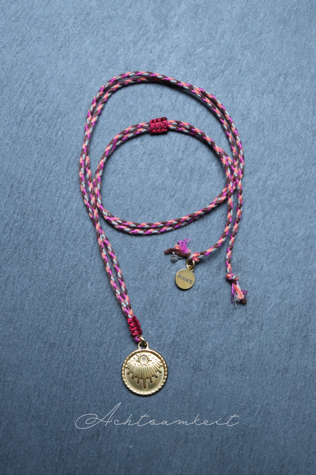 Diese wunderschöne Kette aus handgeflochtener Baumwollschnur in kräftigen Bordeaux-, Rot- und Beigetönen trägt die warme Energie des Lebens in sich. Der goldene Anhänger mit schützendem Auge und sanft nach innen strahlenden Linien symbolisiert Achtsamkeit, innere Klarheit und den Mut, deinem Weg zu folgen. Längenverstellbar, angenehm leicht und perfekt zum Kombinieren mit anderen Lieblingsketten – sie begleitet dich als stilvoller Talisman durch Alltag, Yoga oder Meditation. Ein liebevoller Reminder: Du bist geschützt. Deine Energie leuchtet von innen. Dein Herzensstück für Stärke, Vertrauen & gute Schwingung.