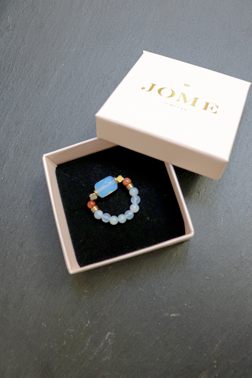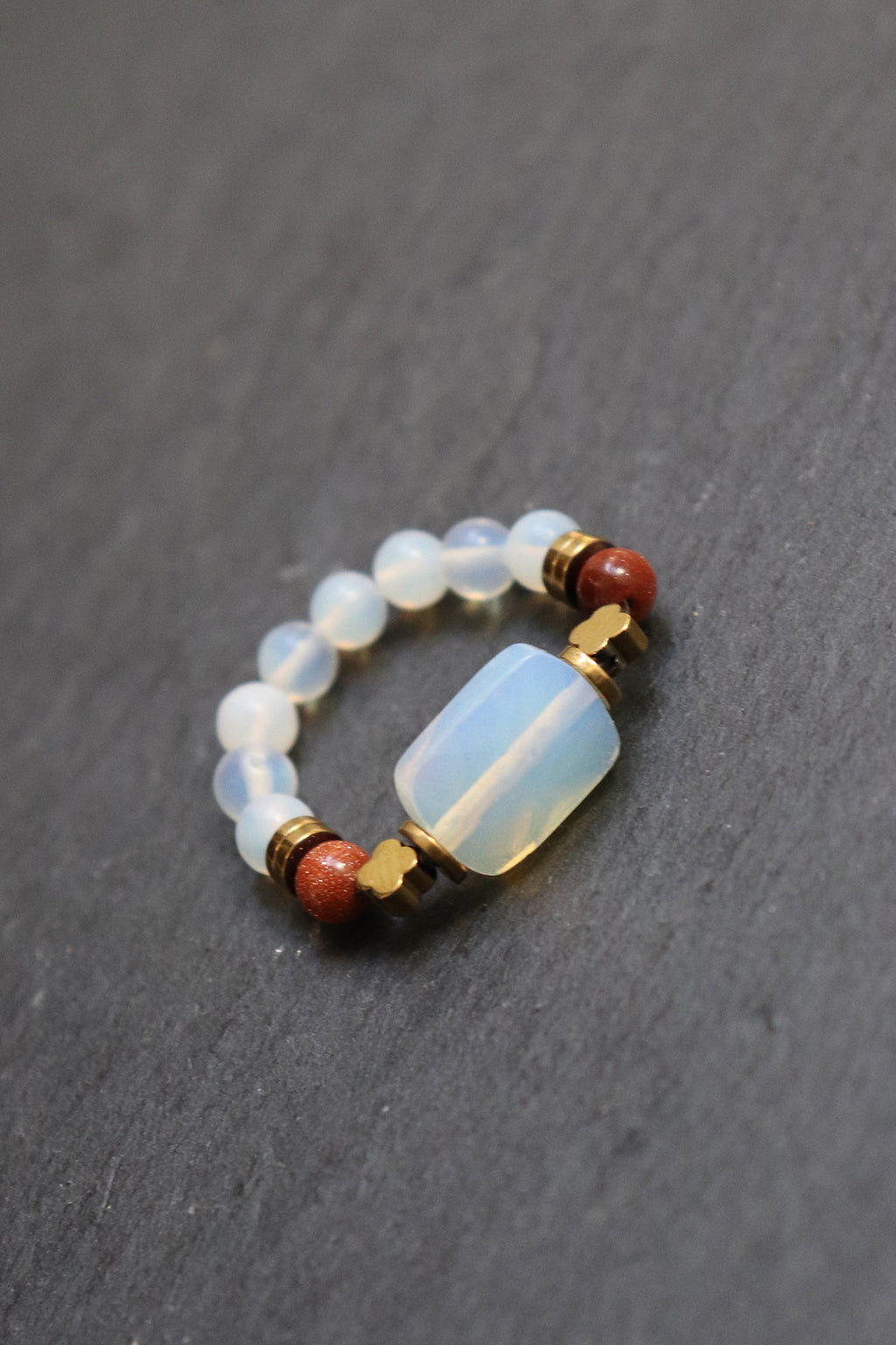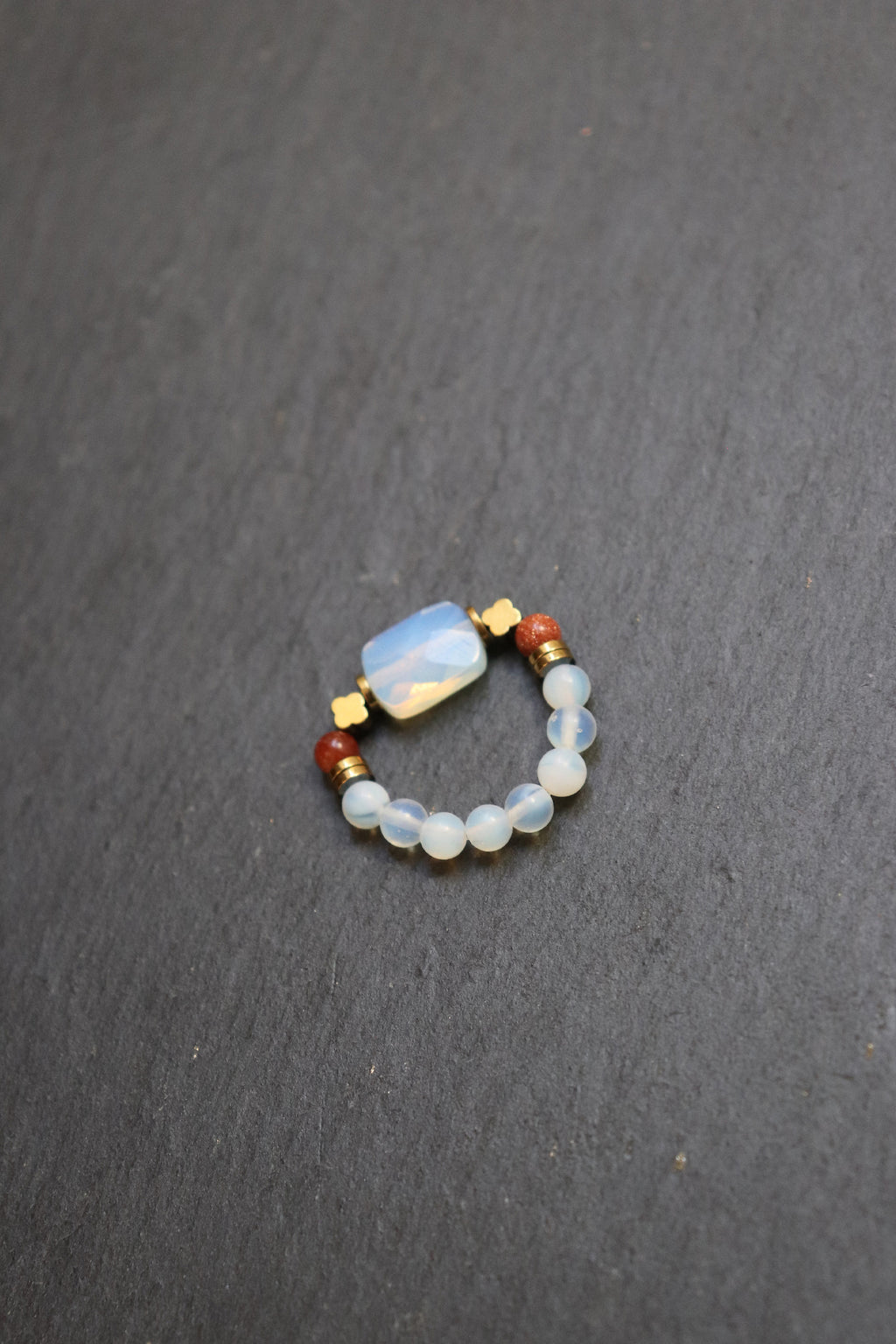 Symbolisch steht das Zusammenspiel dieser Materialien für Klarheit und Stabilität: Leichtigkeit trifft auf Erdung, Offenheit auf innere Ruhe. Als Schmuckstück getragen, wirkt der Ring still begleitend und setzt einen zurückhaltenden Akzent zwischen Zartheit und Stärke.