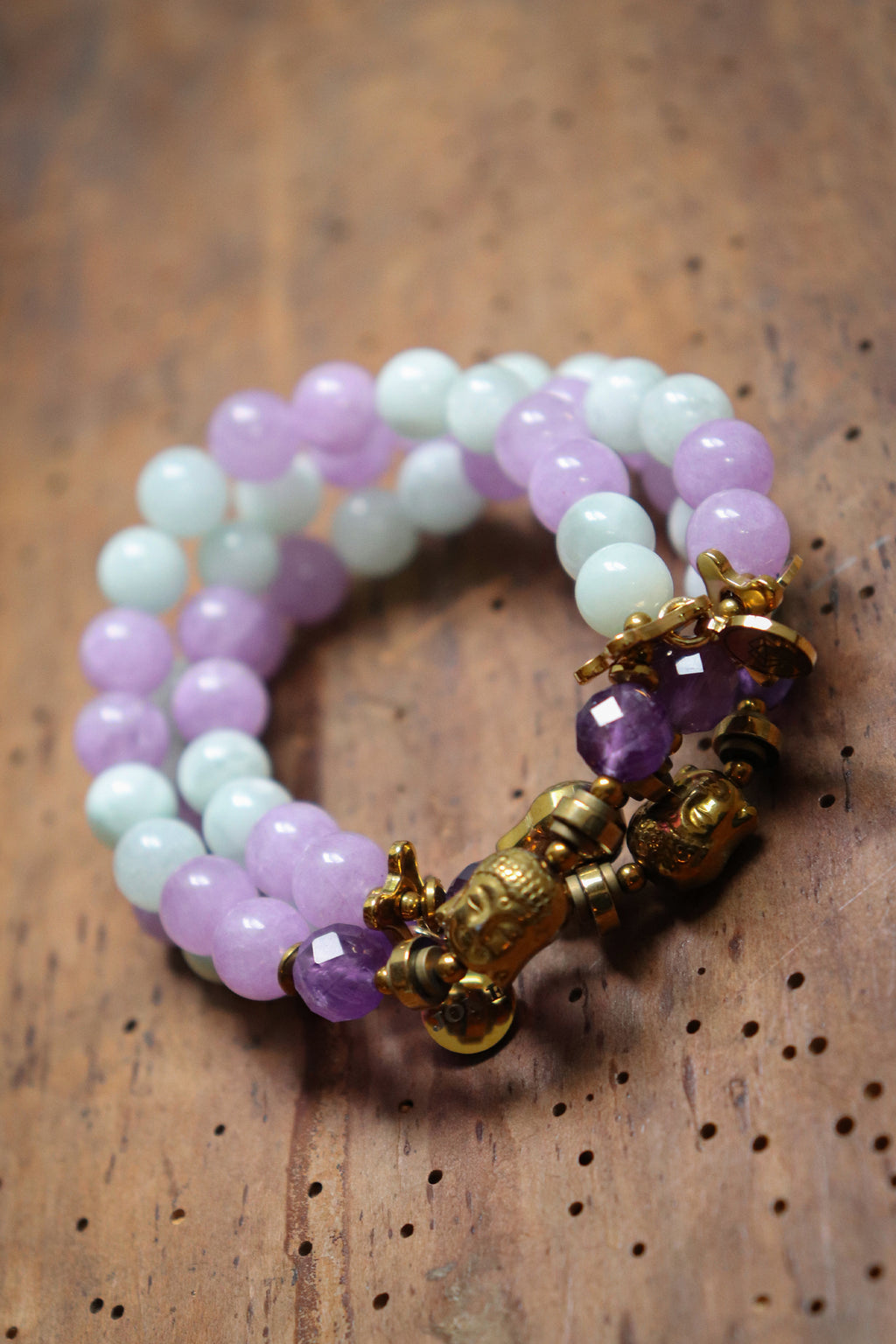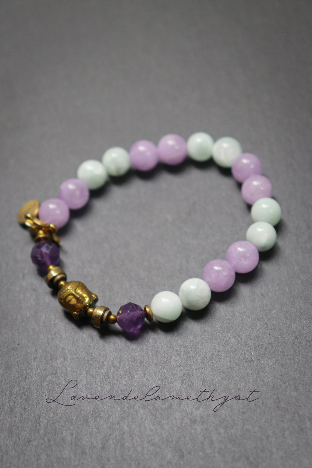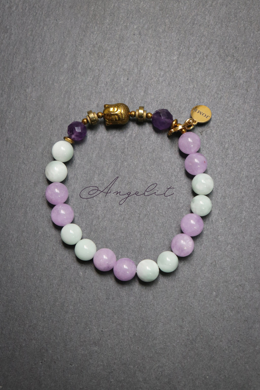 Dieses handgefertigte Armband vereint die sanfte Energie von Lavendel Amethyst, Amethyst, Angelit und Hämatit. Jeder Stein wurde mit Achtsamkeit gewählt, um dich auf deinem Weg zu Ruhe, Klarheit und Ausgeglichenheit zu unterstützen. • Lavendel Amethyst – Klarheit & Gelassenheit • Amethyst – Schutz & innere Balance • Angelit – Frieden & Verbindung • Hämatit – Erdung & Stärke. Alle goldfarbenen Elemente, auch der Buddha-Kopf, bestehen aus Hämatit und schenken dem Armband einen dezenten, edlen Glanz. Ein feines Schmuckstück, das dich Tag für Tag sanft an deine innere Harmonie erinnert.